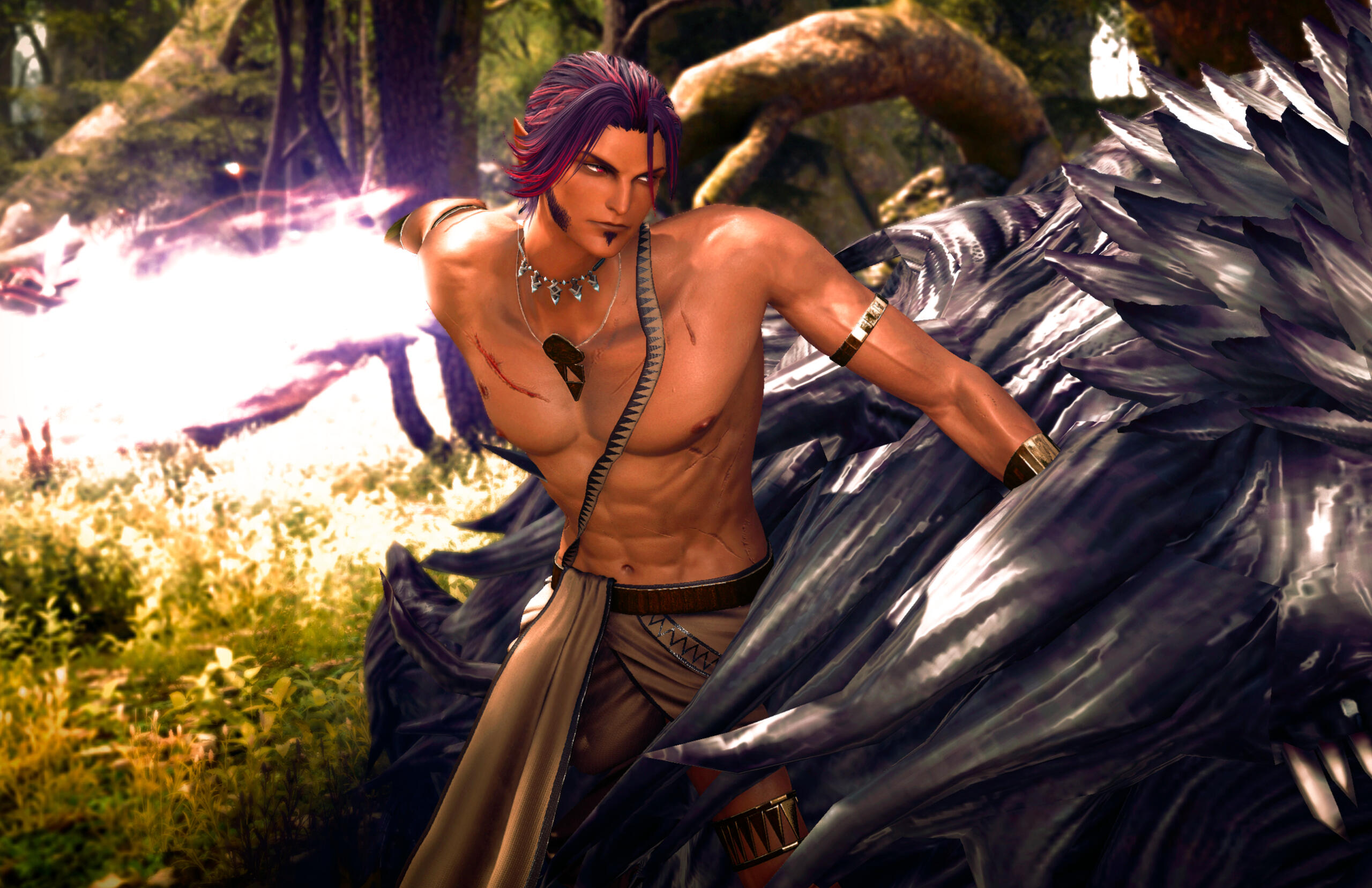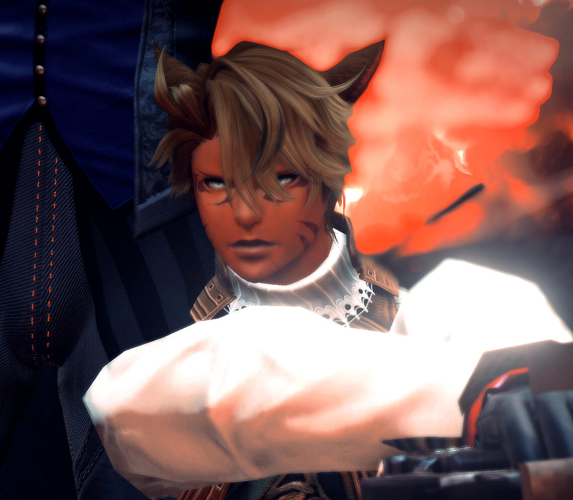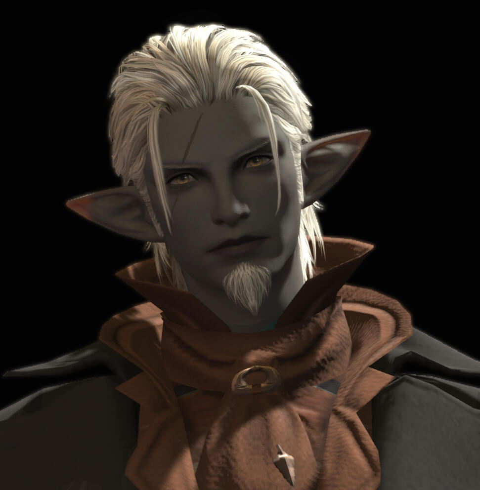 The Dalmascan — Thierry threw himself into the Dalmascan wars hoping to find a new purpose. His organizational skills and leadership experience found him making weapons runs to resistance groups against the Garleans, where he first met 'Vin. They made a good team, both being able leaders in their own right, cementing after O'vin saved Thierry's life from an ambush.Departing for the Far East to negotiate weapon sales and other necessities, Thierry returns to find O'vin gone and most of his tribe killed. He tracked the mi'qote back to Eorzea, finding him impoverished and weakened by aether sickness. Annihilating the people responsible for his friend's plight, he has handed over O'vin's share of their previous profits, established a trade business with him and considers him his best friend, cheerfully weathering through the mi'qote's since-developed explosive anger issues and keeping him out of trouble.[best friends, war buddies, concerned friend]